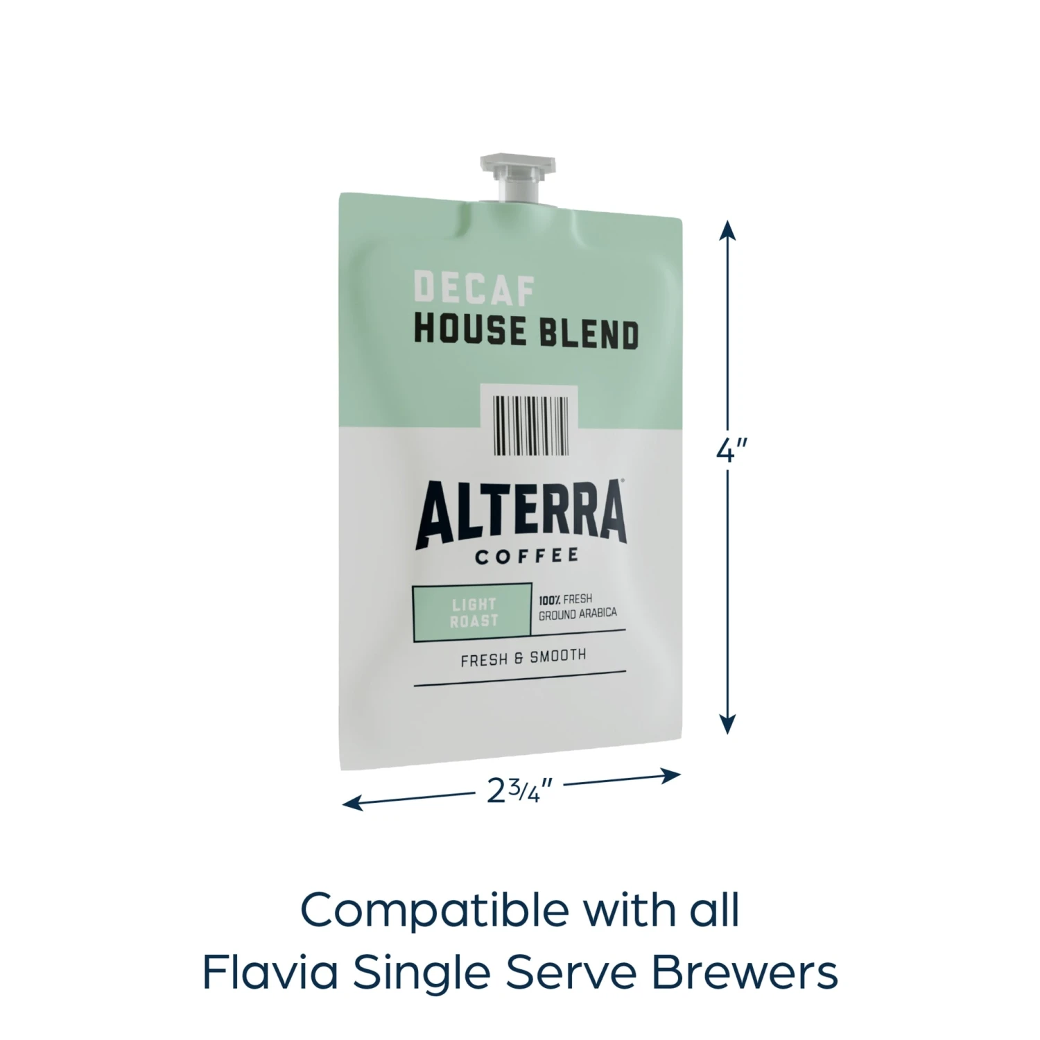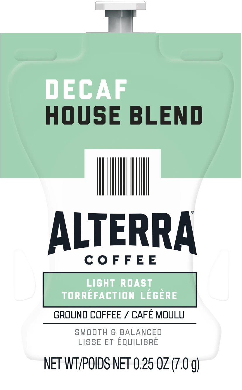 Alterra® Decaf House Blend is a carefully crafted light roast blend made from decaffeinated Arabica coffee with a medium bodied, smooth flavor. Made for your Flavia® Brewer, this Freshpack produces drip coffee.