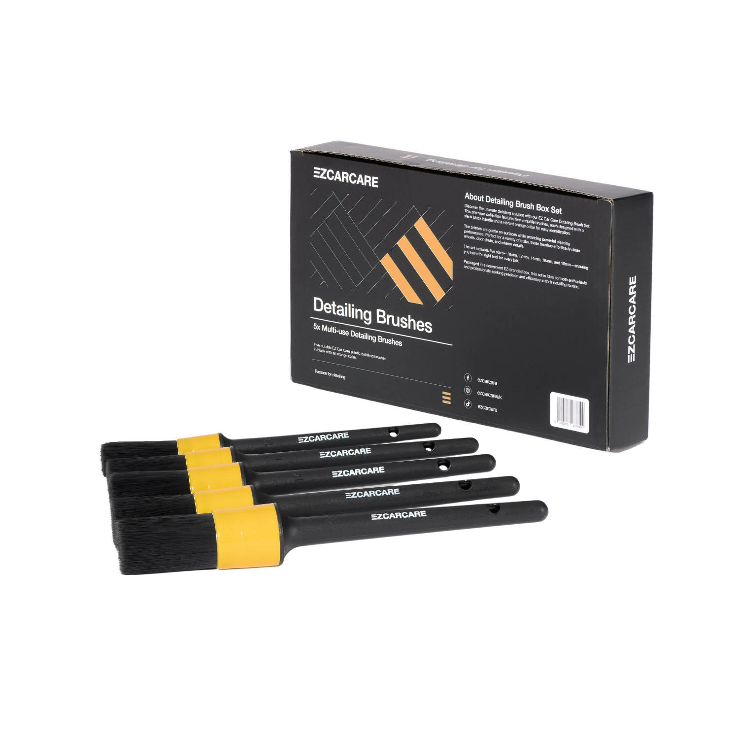 The EZ Car Care Detailing Brush Set includes five premium brushes in varying sizes, designed for safe and effective cleaning across every inch of your vehicle. Each brush features a durable black plastic handle, striking EZ orange collar, and ultra-soft natural bristles that are tough on grime but gentle on surfaces.