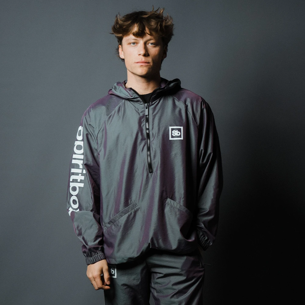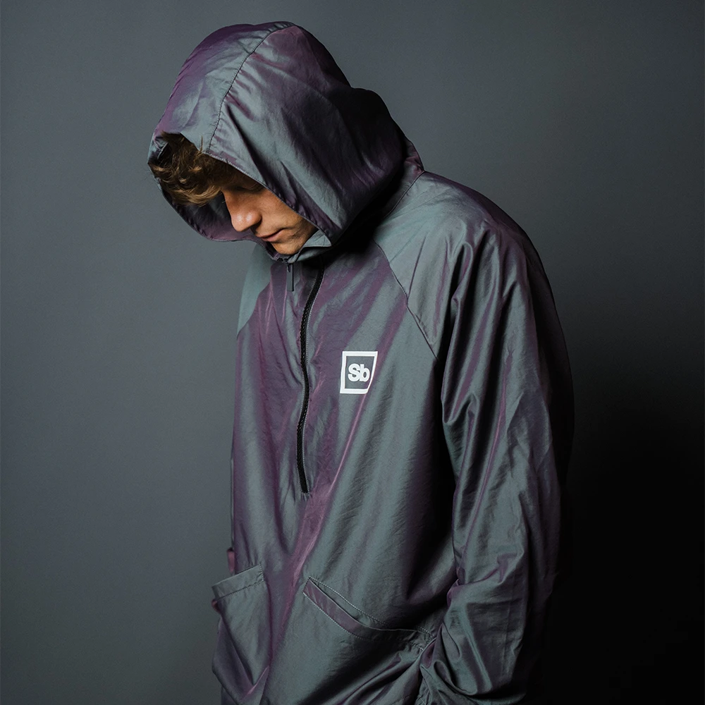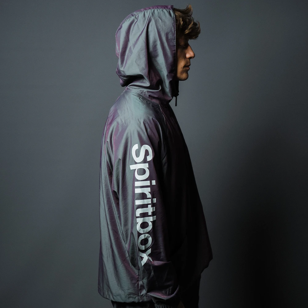 Our newest fully cut and sewn iridescent track jacket. The jacket is made from a mid-weight wind-proof nylon. The iridescent material appears to change color based on the light and angle you look at it.