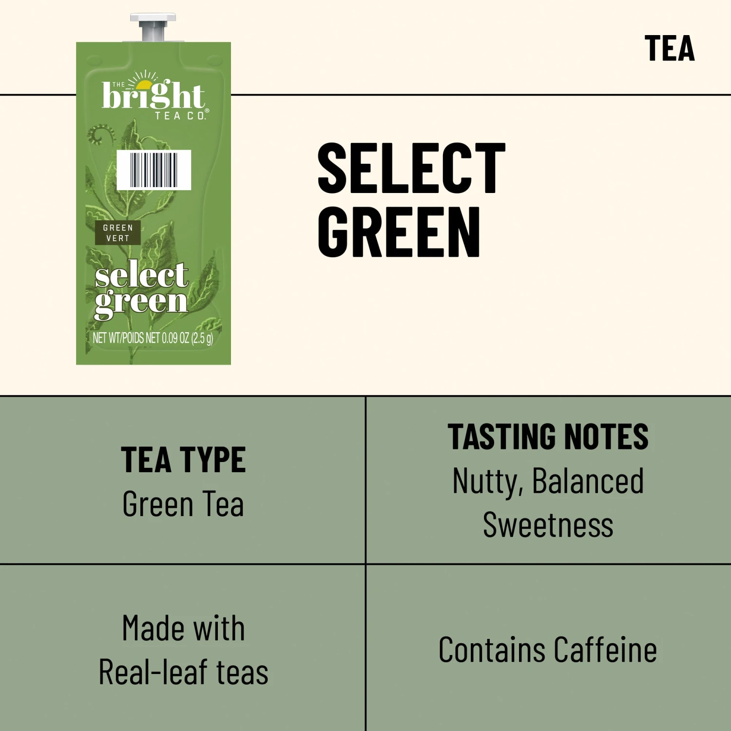 Bright Tea Co.® Select Green Tea is a smooth and herbaceous green tea with a nutty aroma, balanced bite, and a touch of sweetness. Made for your Flavia® Brewer, this Freshpack produces a single-serve tea.